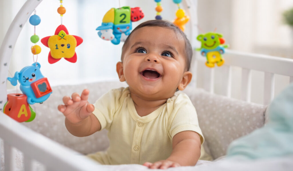 The American Academy of Pediatrics notes that between 4–6 months, babies develop coordinated reaching and begin exploring objects intentionally.